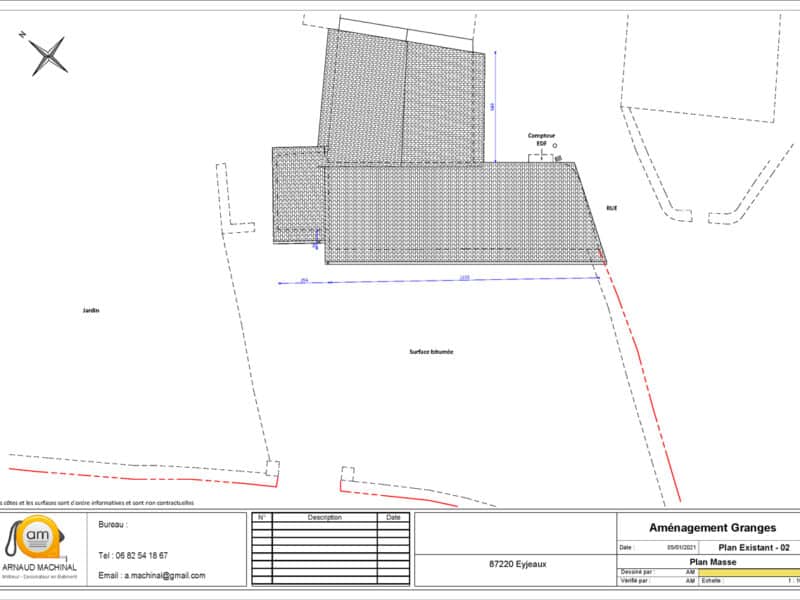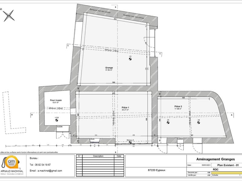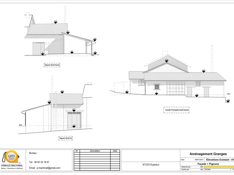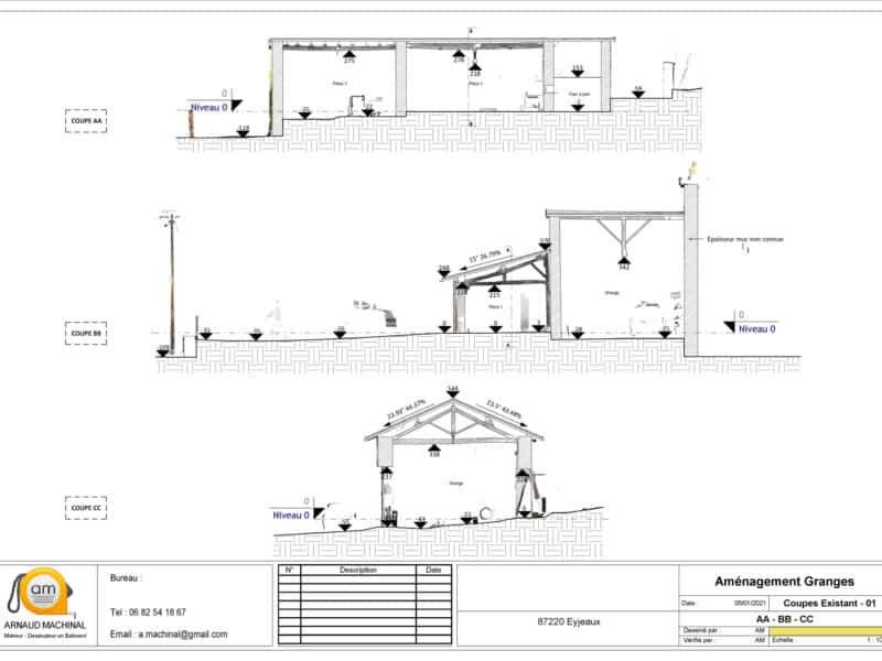 M Stéphane AVERTY, maître d'oeuvre, nous demande de faire le plan, les façades et 3 coupes de l’existant de deux granges attenantes. De ces éléments il pourra par la suite, faire lui-même un plan de projet, à partir de notre travail, notamment en réunissant les deux granges pour un même logement (qui sera à louer).
